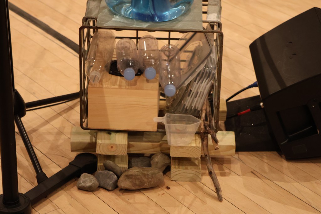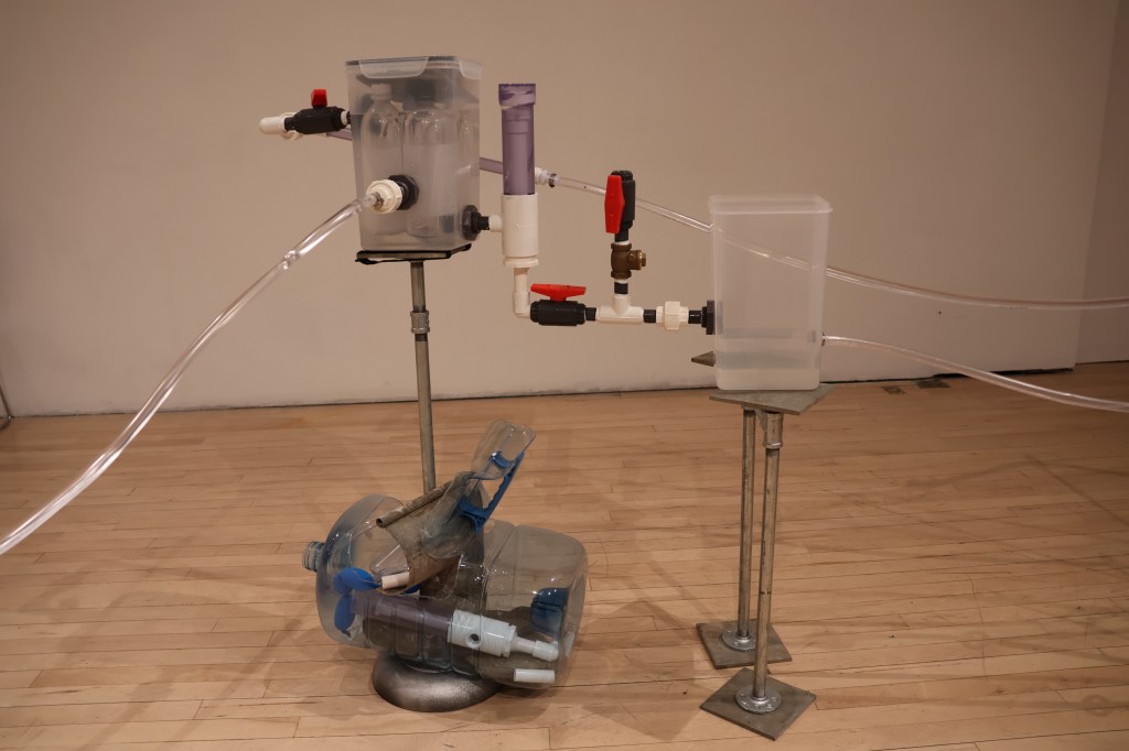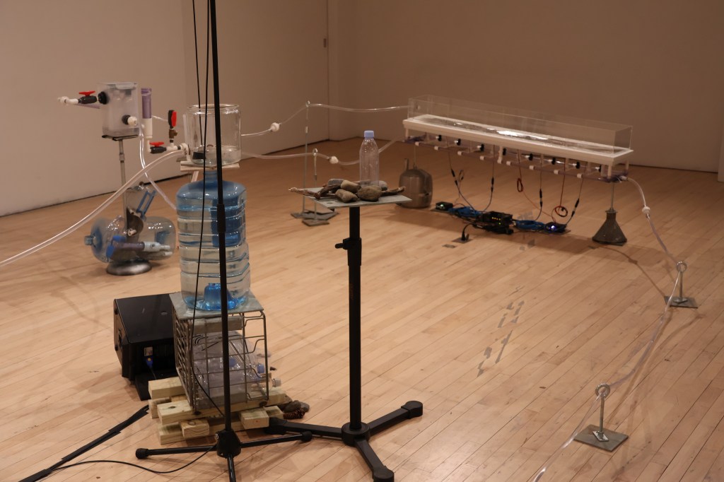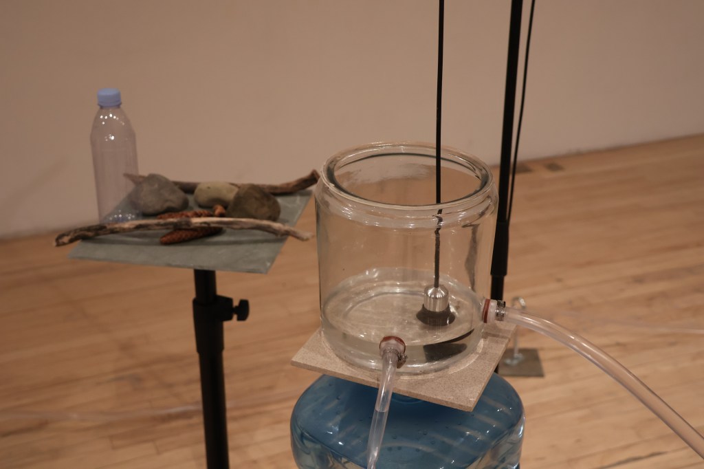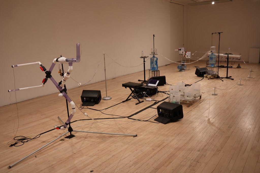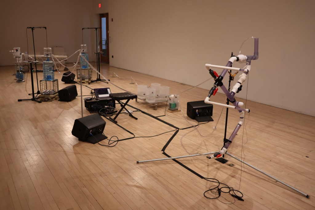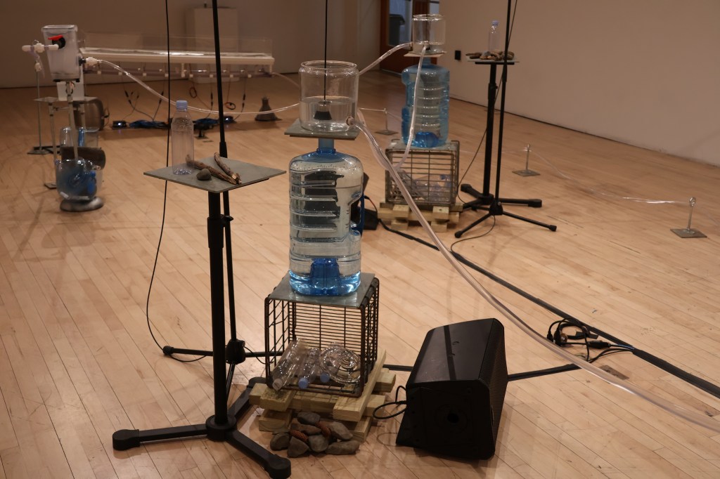 materials: water, vinyl tubing, PVC pipe, steel/iron pipe & rods, glass jars, valves, plexiglass, aluminum foil, super absorbent polymers, plastic, wood, stones, sticks, pinecones, microphones, speakers, amplifiers, microphone stands, computer/microcomputers, salvaged metal and stone/ceramic tiles