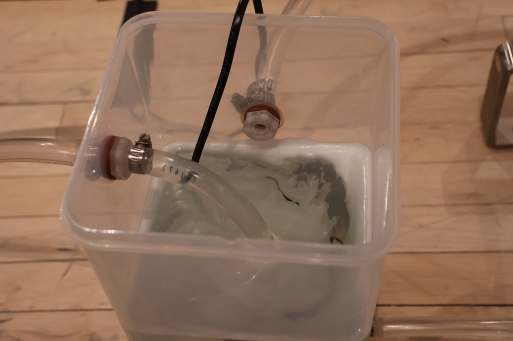 2. hydro-clarinet system: a tall network of PVC pipes and valves. A tube splitter controls the ratio of water entering the instrument and that which bypasses it to continue to the rest of the system. Microphones placed inside tubes amplify the internal sound of flowing water. The tubes are telescoping, allowing one to tune different resonances. When played with a clarinet mouthpiece attachment, listeners will hear either the natural sound of the clarinet reed or the sound of a vibrating check valve (internal to the system) caused by air pressure. The instrument’s water output returns to the main reservoir and helps ensure that enough water will be maintained there to keep the pump functioning.