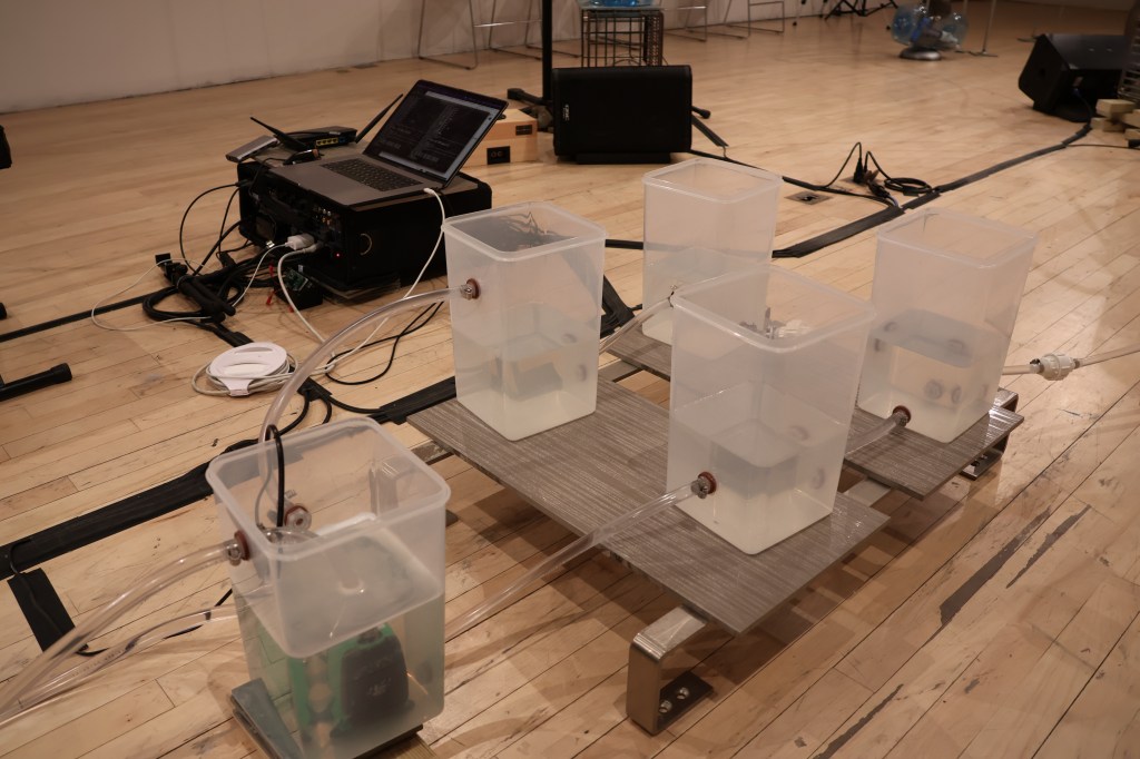 In Transient Flows Intonation, the environment is the water system/gallery space as heard through two microphones placed inside the hydro-clarinet system. The piece uses a gradually shrinking time window (how much time elapses before a live microphone generates new pitches) to reveal thresholds between where our actions can amplify environmental harmonies and where they overwhelm them. In reservoirs, the environment is the water system/gallery space as heard through two hydrophones (microphones made for water) placed inside glass jars connected to each other with a siphon. The hydrophones monitor the changing water levels by making periodic recordings and playing back the most prominent frequencies. By manipulating the water levels, the two performers attempt to find sonic relationships between the reservoirs while dealing with time delays in the physical system and those of the monitoring system.