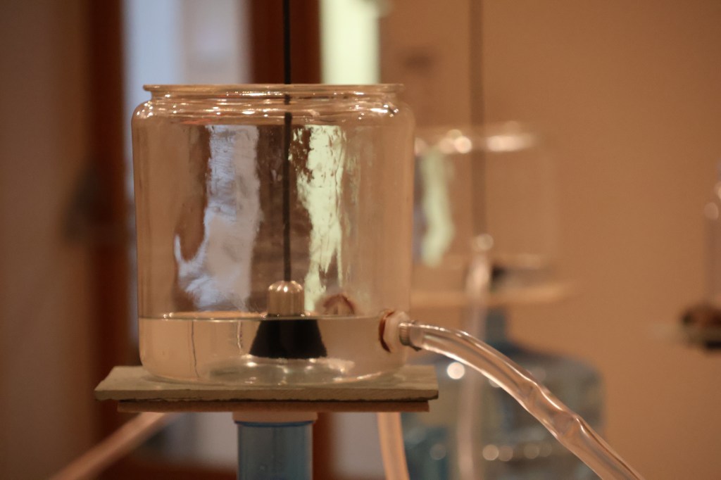3. reservoirs system: not to be confused with the main reservoirs, these two glass jars provide temporary storage for water in the middle of the system. A siphon controls the flow of water between them, meaning that they both respond to a change in water level in either jar. Microphones feed the sound from inside the water of each jar to a program which selects the loudest frequencies each time it is triggered and plays them back through speakers located below the jars. The second reservoir’s output advances to a siphon system.